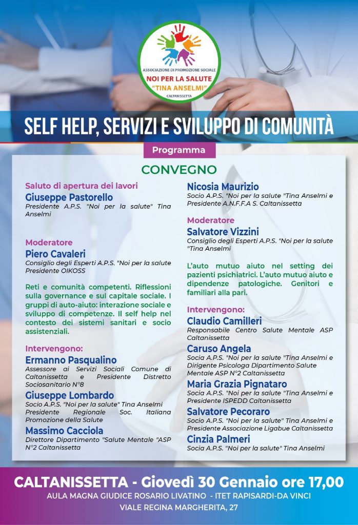 Nel contesto dell’impegno dell’A.P.S. ” Noi per la salute” Tina Anselmi nell’ambito della Salute Mentale si inserisce questo convegno sull’autoaiuto. Metteremo a conoscenza dei cittadini, grazie alla partecipazione di esperti, l’importanza dei gruppi di automutuoaiuto in cui l’aiuto non proviene solo da sé stessi, ma anche dagli membri del gruppo guidato da un facilitatore.